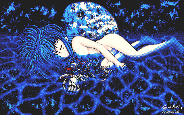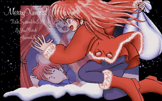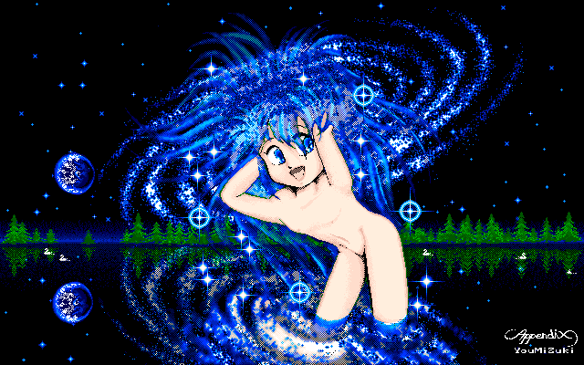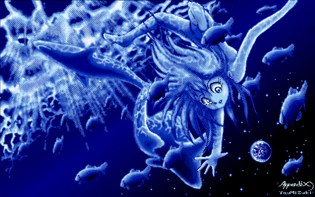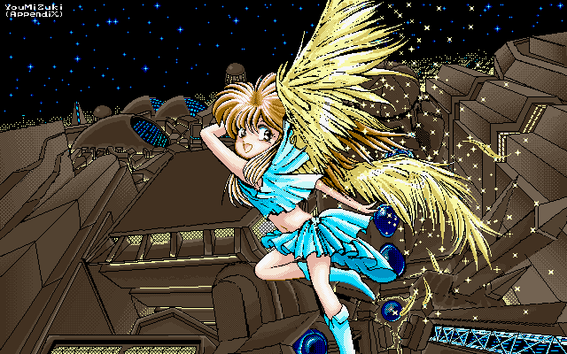 これは某ComputerFanに寄稿するために描いた作品です。それなりに 気合いれたんですけど、後からみるとさして面白い絵でもありませんね ・・・・。中心からのボウッとした光の雰囲気が出したかったんですけ どね。女の子の服が僕がこういうのしか描けないとはいえ単調すぎて悲 しいです・・・ダウンロードサイズ 42Kbyte (640×400)